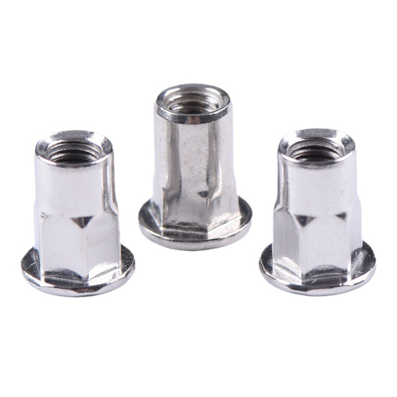 汎用性の高い六角リベットナットは、本体が六角形です。丸型と違い、一度取り付けると回転しにくい形状です。これはデザインの重要な部分であり、対応する六角形の穴にフィットするように作られています。こうすることで、ネジを締めるときにナットが一緒に回転することがなくなります。フルヘキサゴンスタイルやセミヘキサゴンスタイルなど、さまざまなタイプが用意されています。頭部には平頭や小型皿頭などのオプションもあります。素材と面一にしたい場合や、施工後に少し出っ張るだけにする場合など、ニーズに合わせてお選びいただけます。